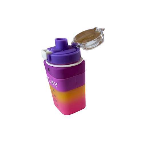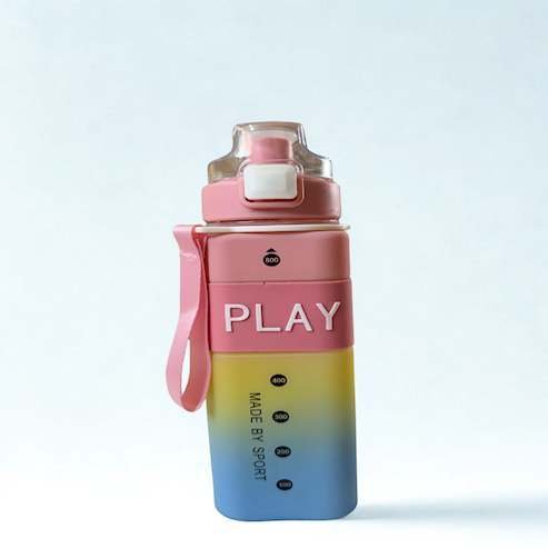 Attractive Gradient Design: Stylish pink–yellow–blue triple-tone finish with embossed PLAY branding.Leakproof Flip-Top Lid: One-touch opening with secure lock to prevent spills while travelling.Measurement Markings: Easy-to-read 100ml to 800ml indicators to track water intake.BPA-Free & Safe: Made using high-quality, food-grade plastic suitable for daily use.Easy to Carry: Includes a strong hand strap for school, gym, trekking, and outdoor use.